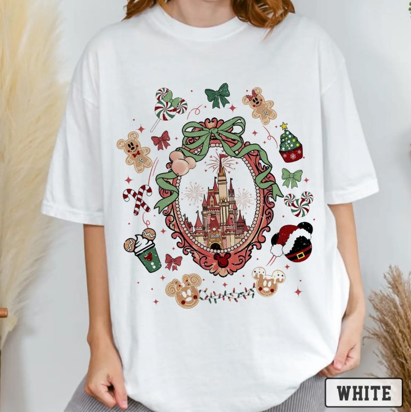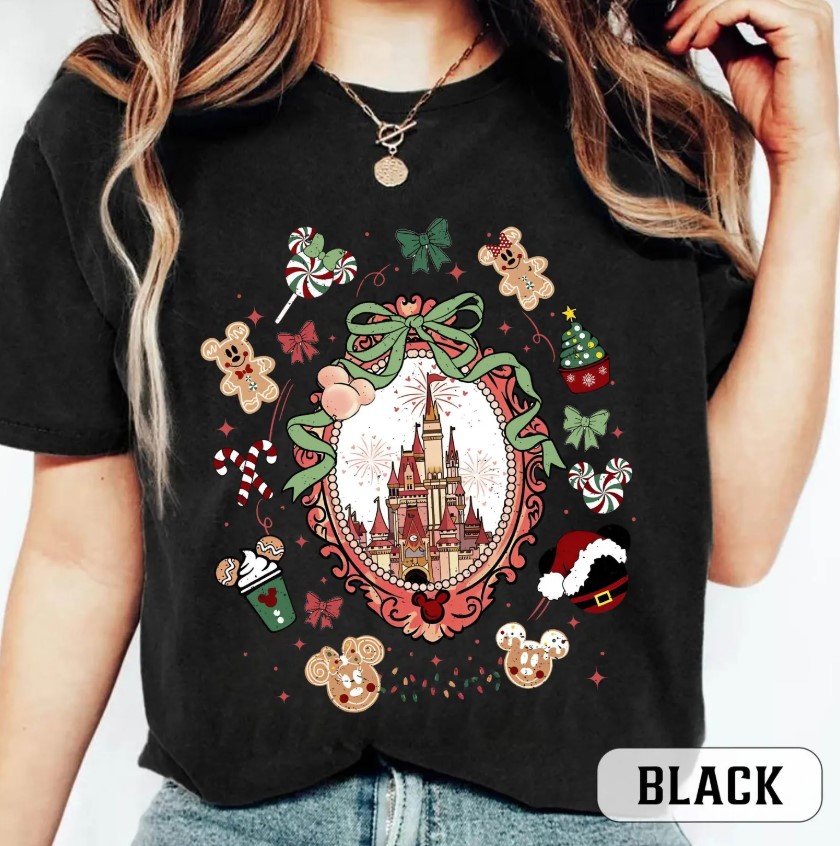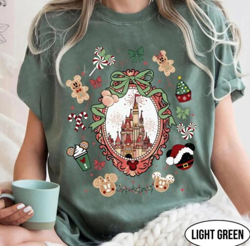 Comfor Color Coquette Bows Disneyland Castle Christmas T-shirt and Sweatshirt, Magic Kingdom Christmas Shirt, Disney Christmas Shirt, Mickey and Friends Christmas Shirt