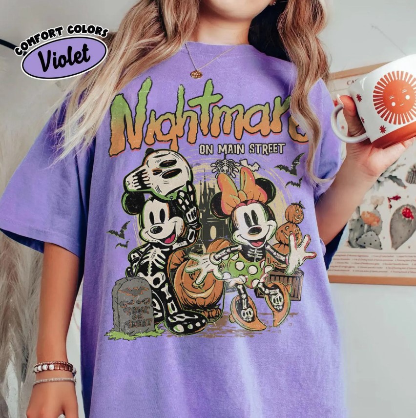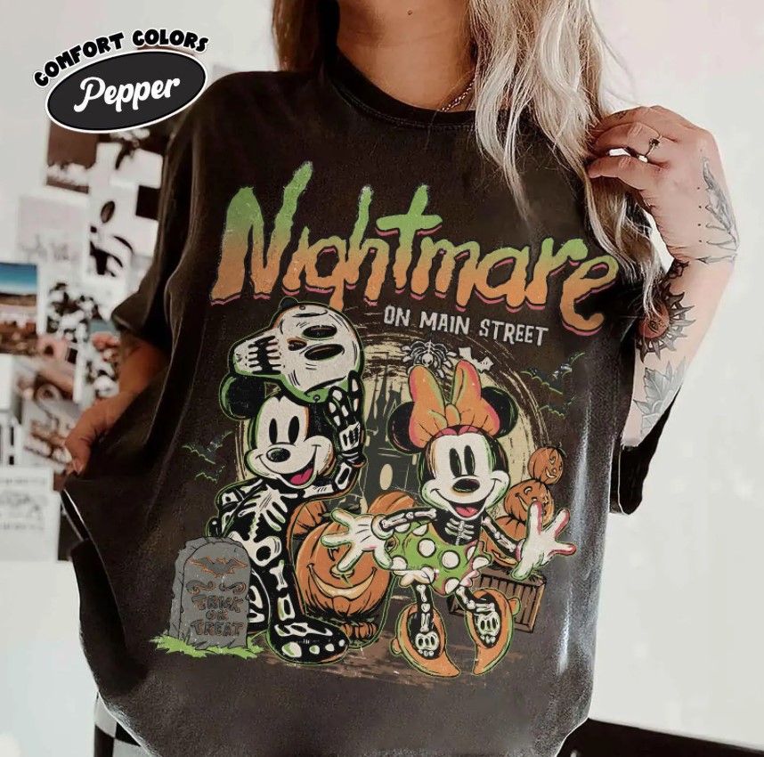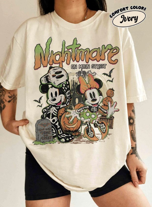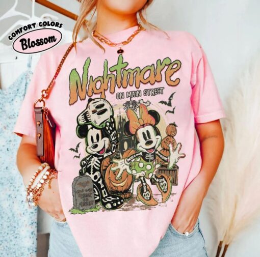 Comfor Color Mickey & Minnie Skeleton Nightmare On Main Street T-shirt and Sweatshirt, Mickey Skeleton Shirts, Disney Trip Halloween 2025 Shirts